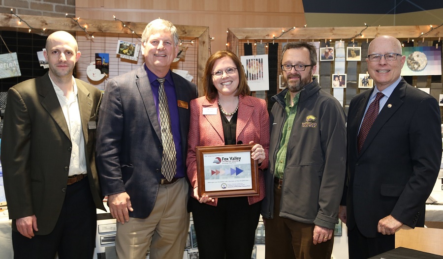 Celebrating the new articulation agreement were (from left): Aaron Kadoch, head of UW-Stevens Point’s Division of Interior Architecture; Marty Loy, dean of UW-Stevens Point College of Professional Studies; Kim Olson, dean of FVTC’s Service Division; Greg Summers, UW-Stevens Point provost and vice chancellor of Academic Affairs; and Bernie Patterson, UW-Stevens Point chancellor.