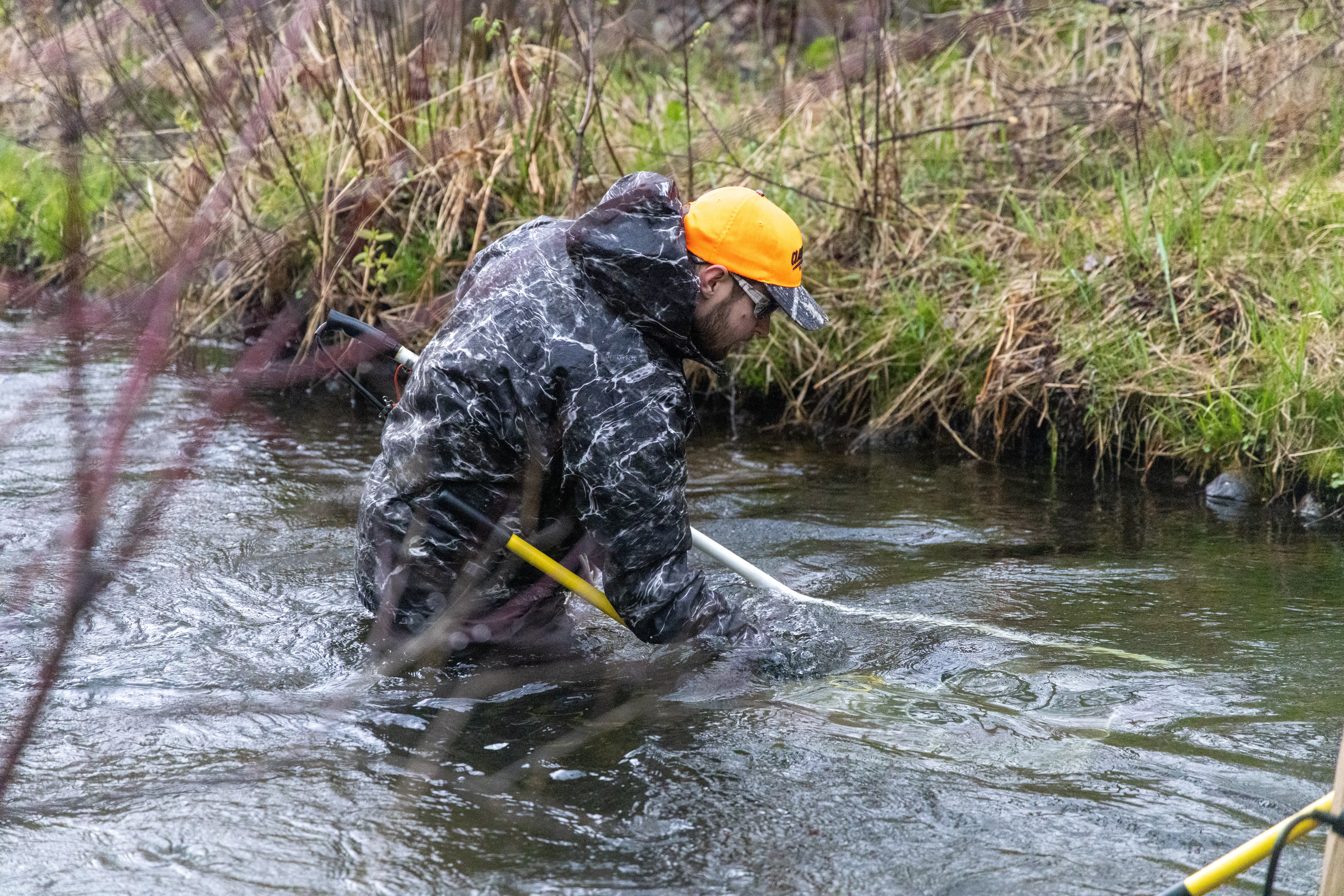 “It does not electrocute them. It doesn’t harm them,” explains Paul Groell, department chair of the Natural Resources program. “With electricity, it forces their muscles to contract and they swim toward our probe. Each student has a probe and a net and they work the probe into the cover, drawing the fish out.”